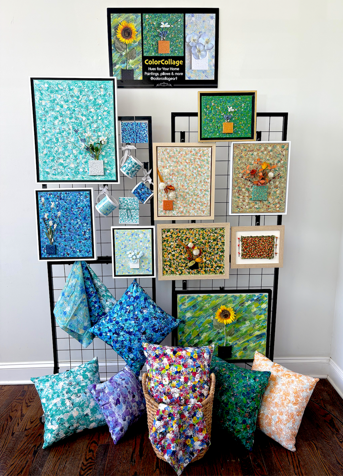 ColorCollage features textured acrylic-on-canvas paintings by emerging Chicago-based artist Kathleen Furore. The paintings are accented with canvas "vases" and faux flowers to create a 3D effect. Prints, pillows, mugs and note cards made from the original designs are part of the collection.